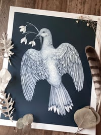 Archival giclee print of a mourning dove carrying snowdrop flowers, illustrated by Jessica Roux.